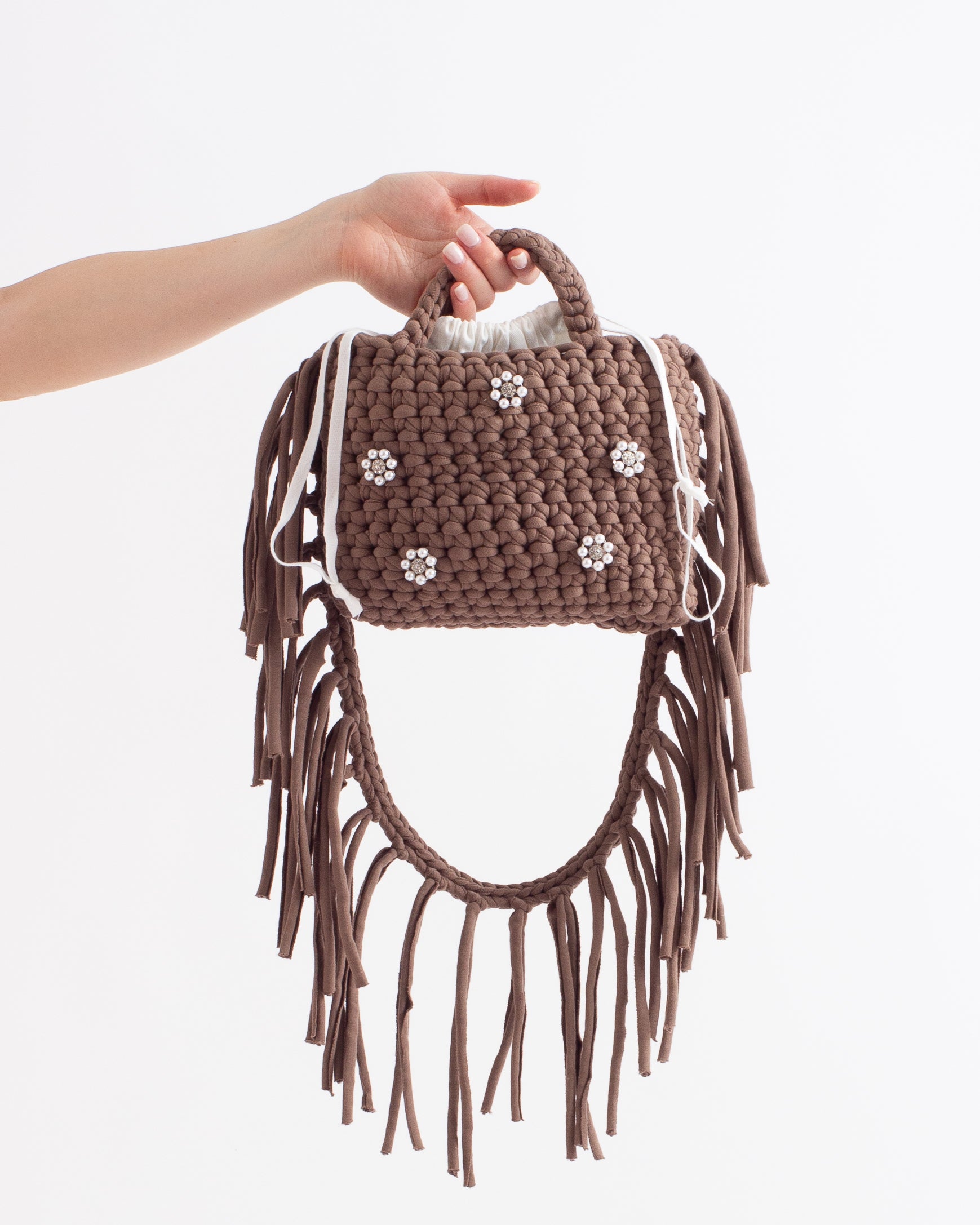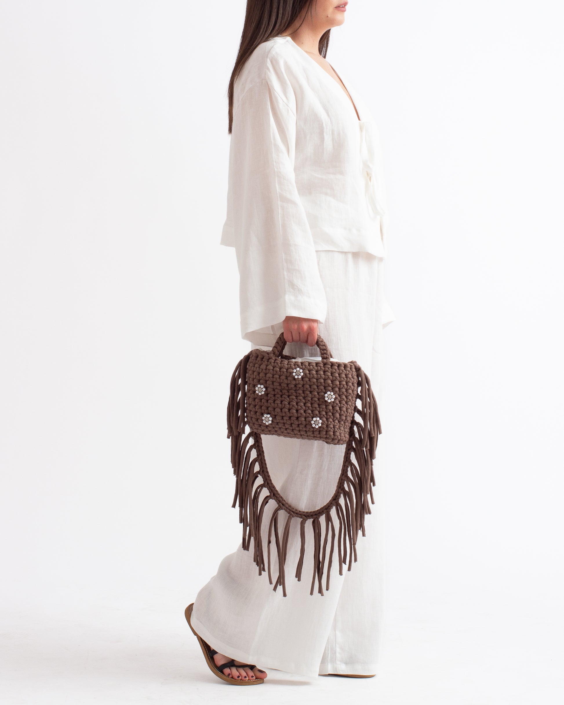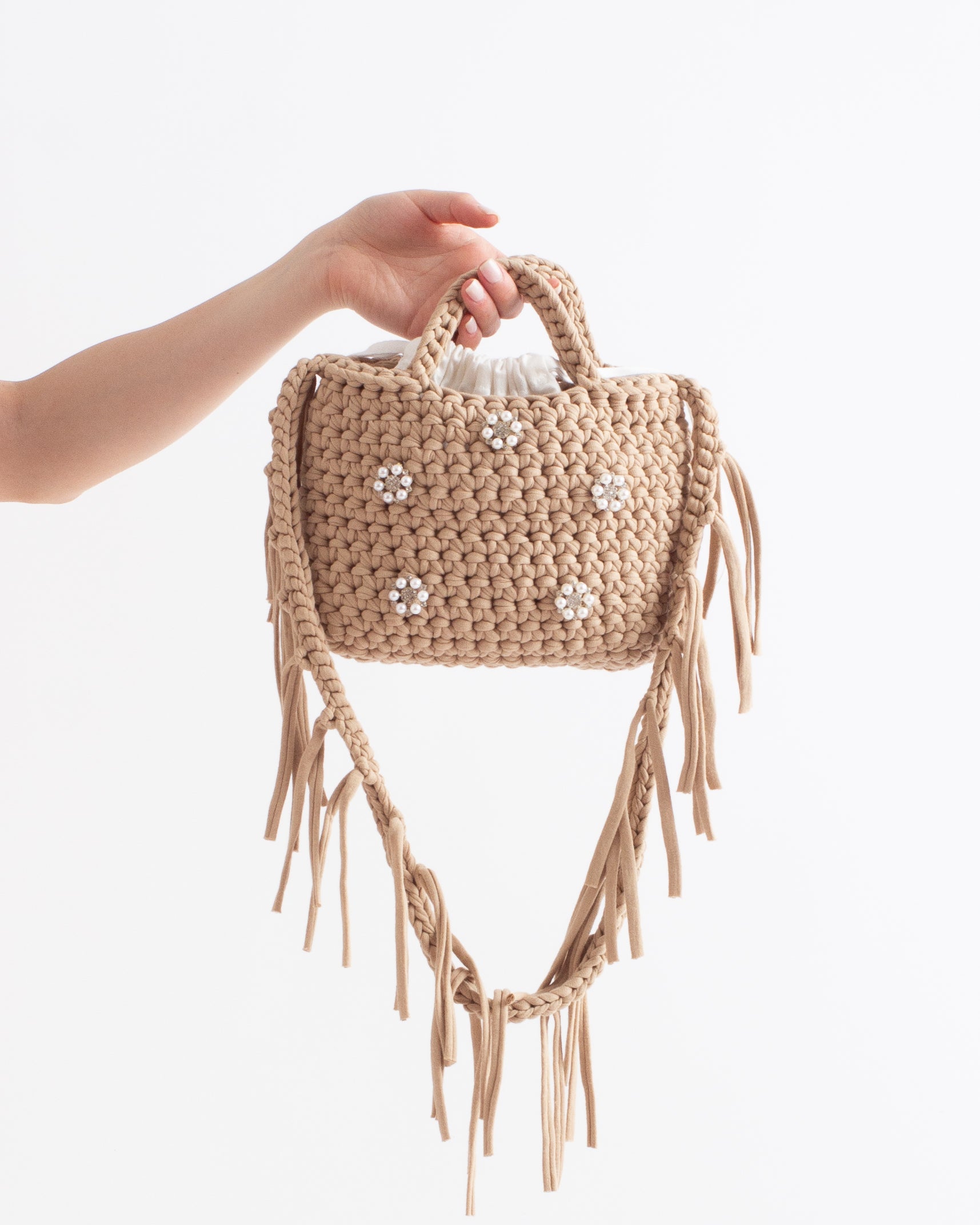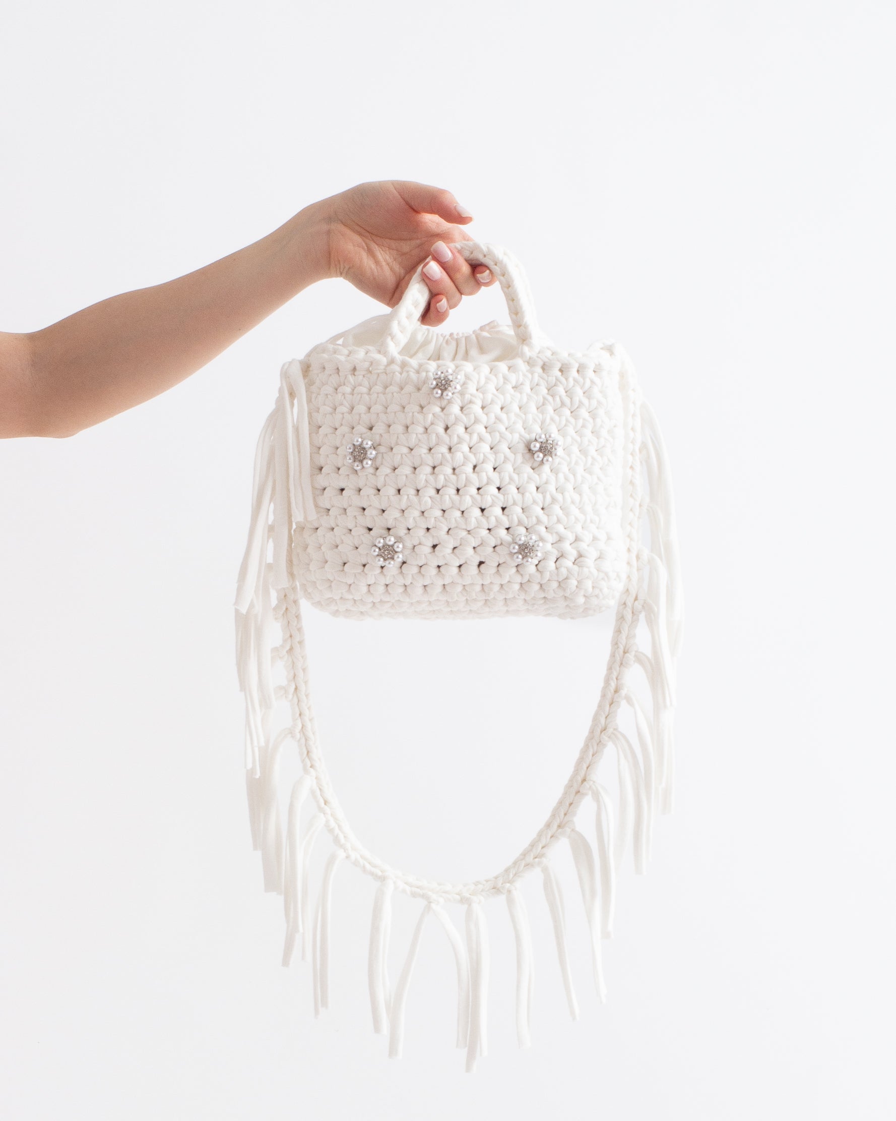 Borsa all'uncinetto realizzata a mano in cotone 100% con bottoni gioiello e sacca interna, sempre in cotone.