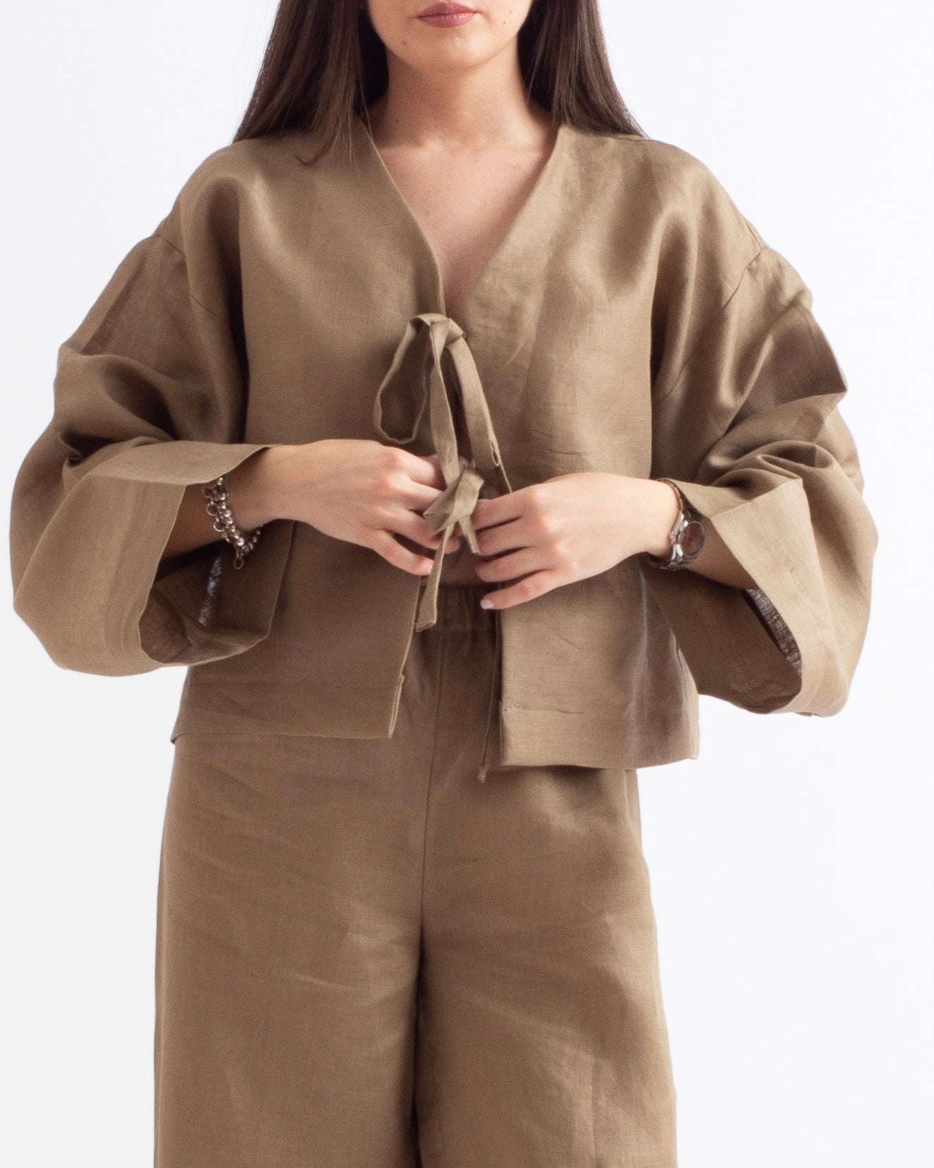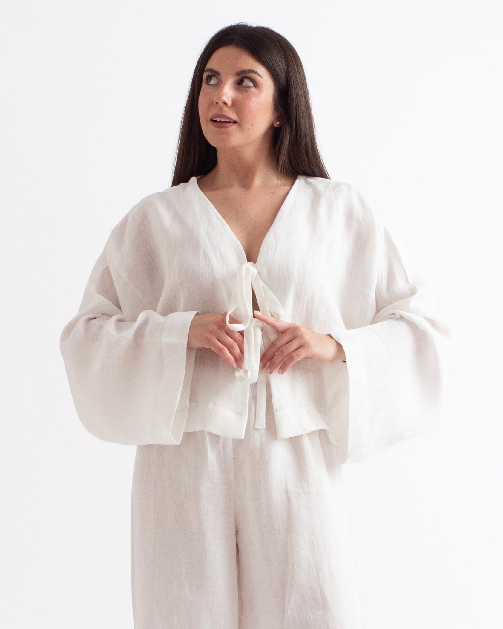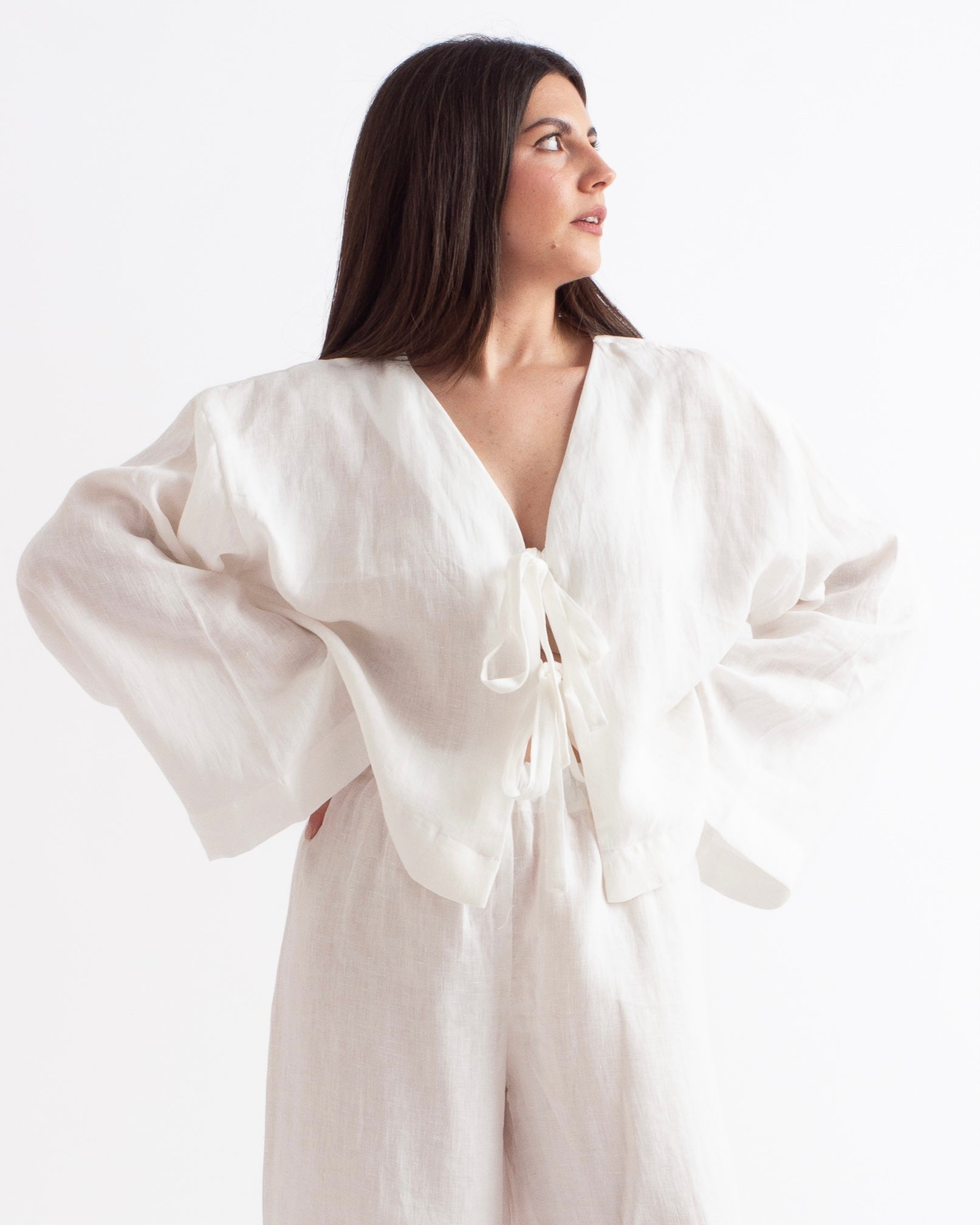 Camicia in Lino 100% con scollo profondo a V, maniche lunghe ampie e allacciatura frontale con fiocchi.