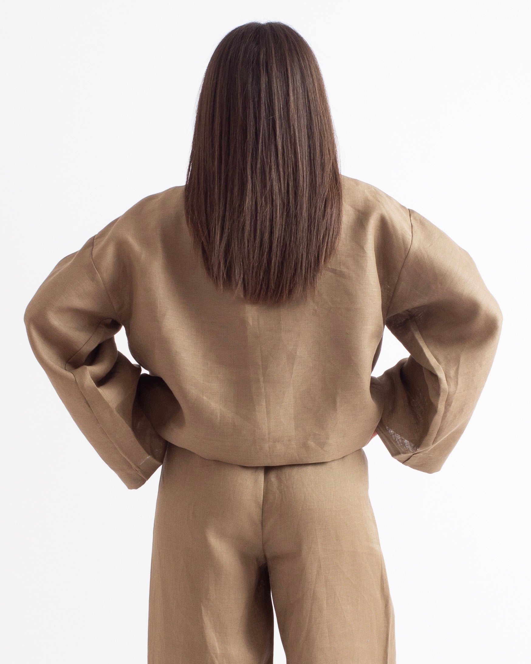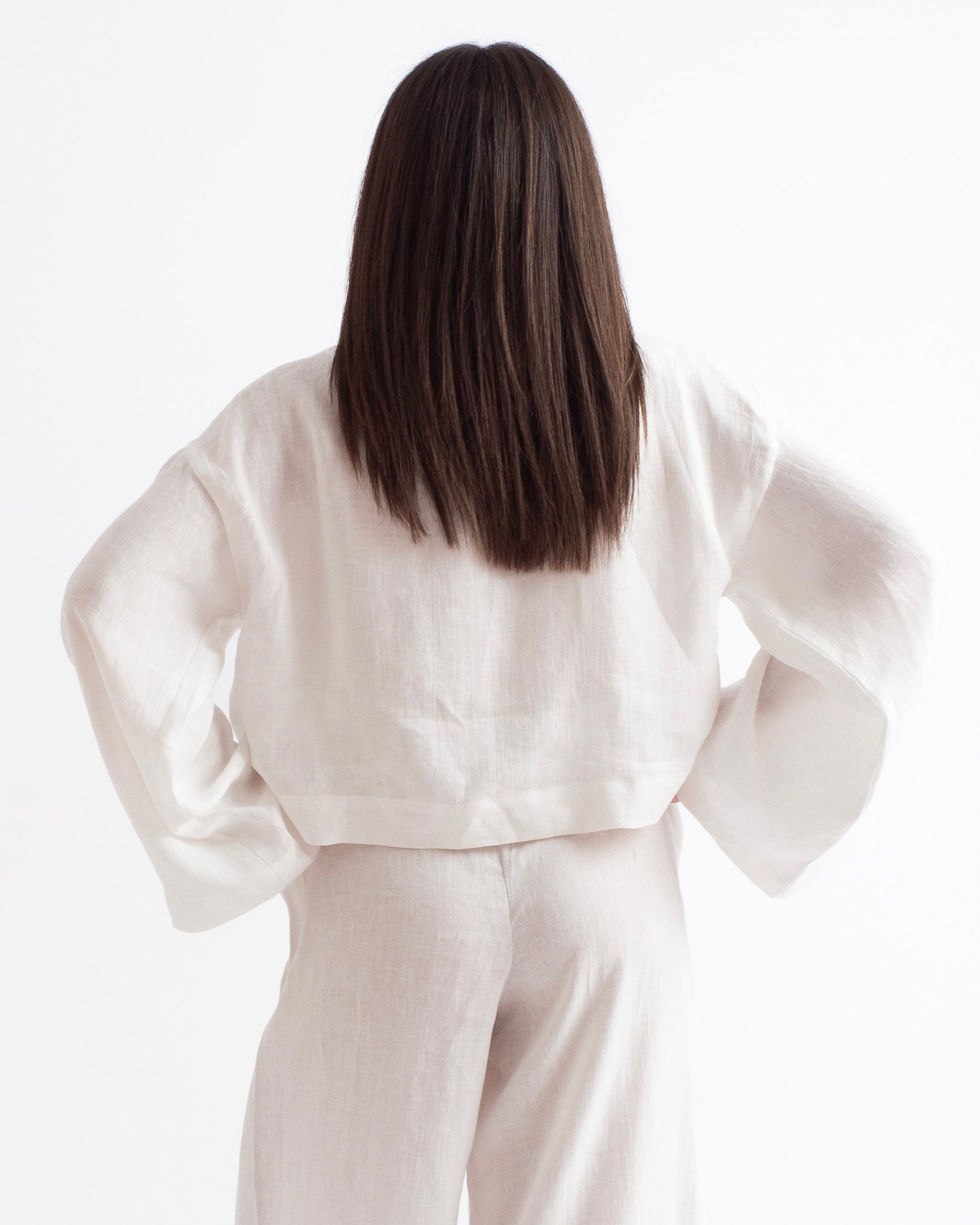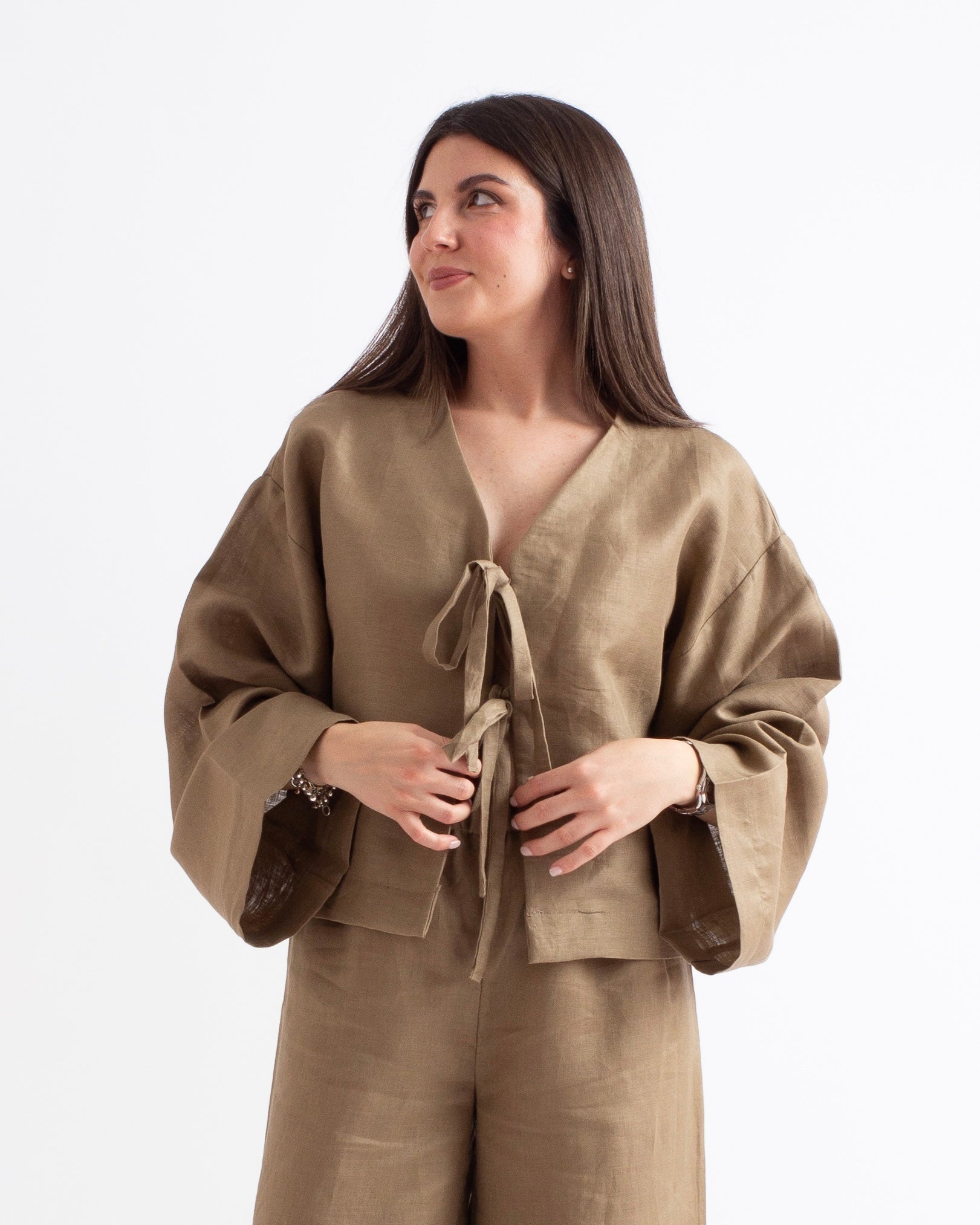 Camicia in Lino 100% con scollo profondo a V, maniche lunghe ampie e allacciatura frontale con fiocchi.