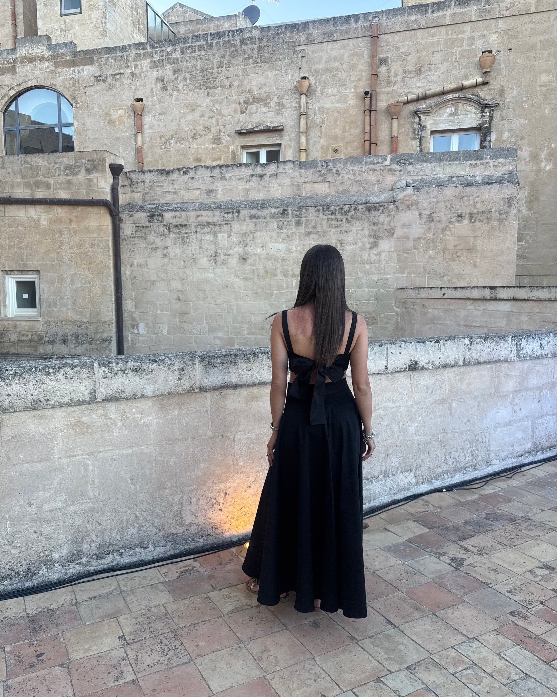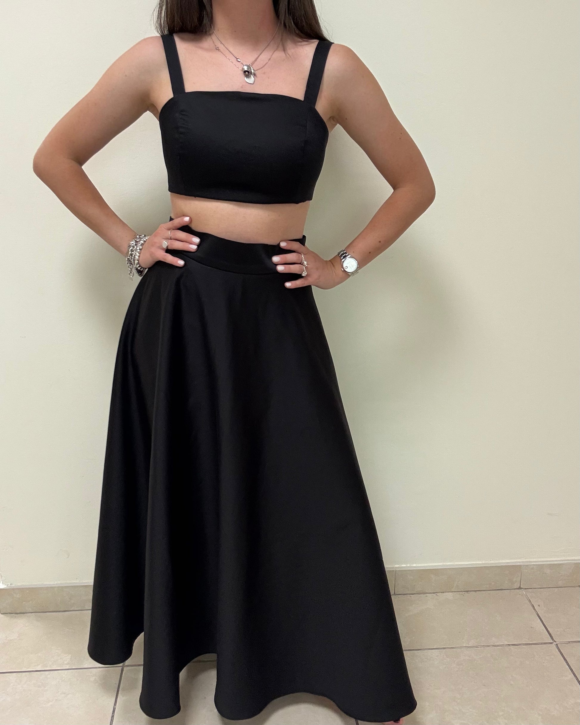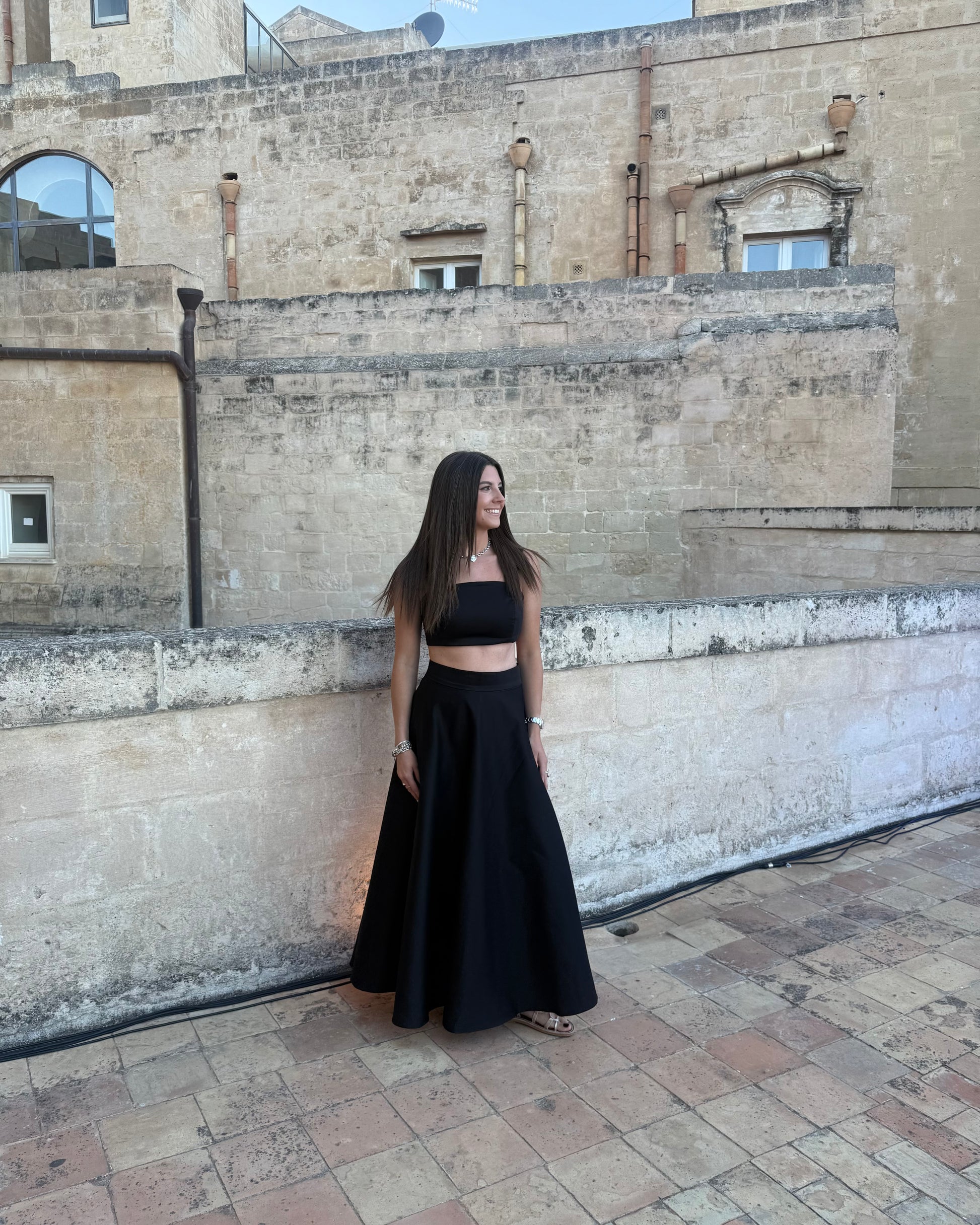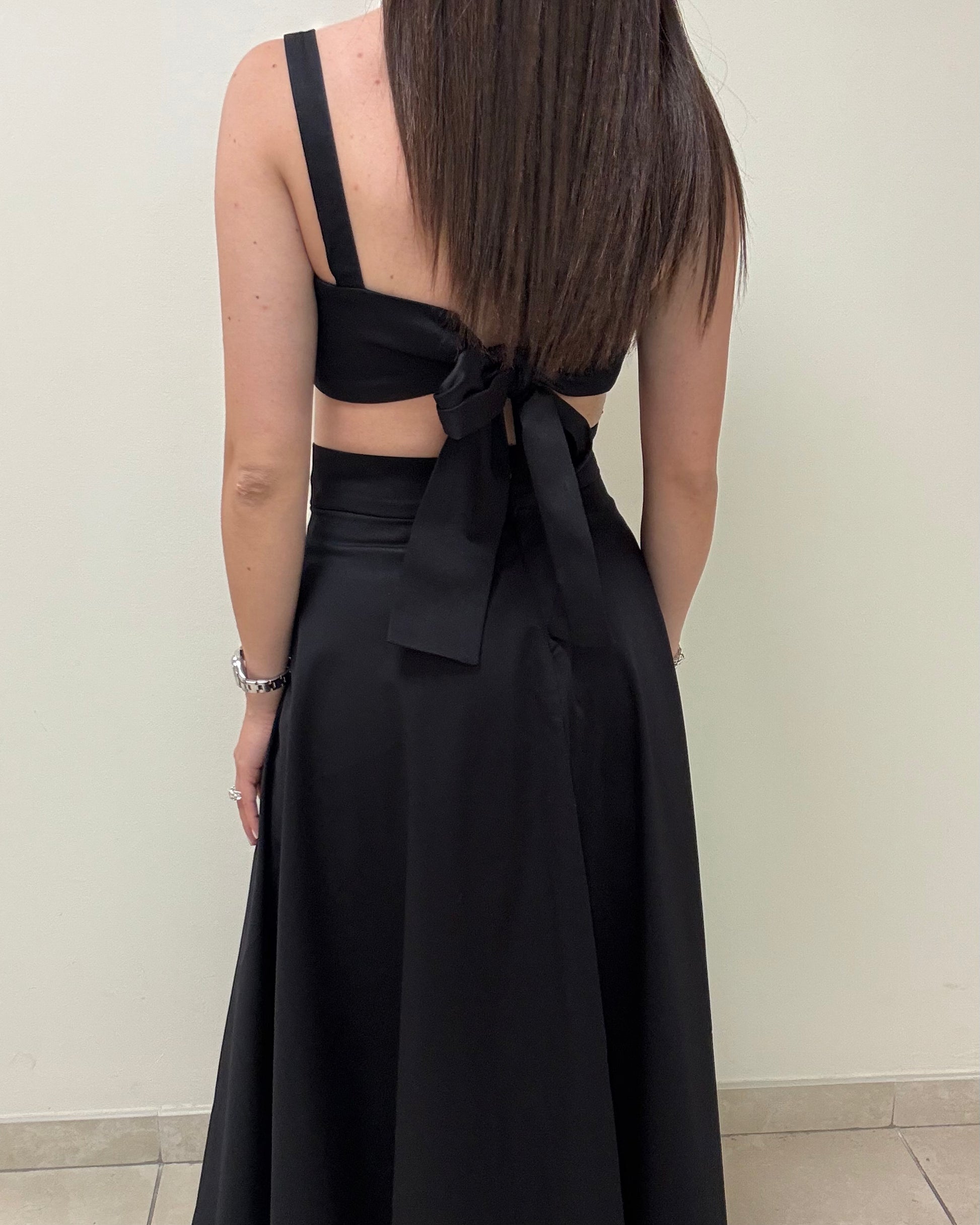 Completo in cotone 100% composto da un top con fiocco regolabile sul retro e una gonna a mezza ruota con cintura e cerniera invisibile. Il tessuto, luminoso e naturale, valorizza ogni silhouette con leggerezza e stile.