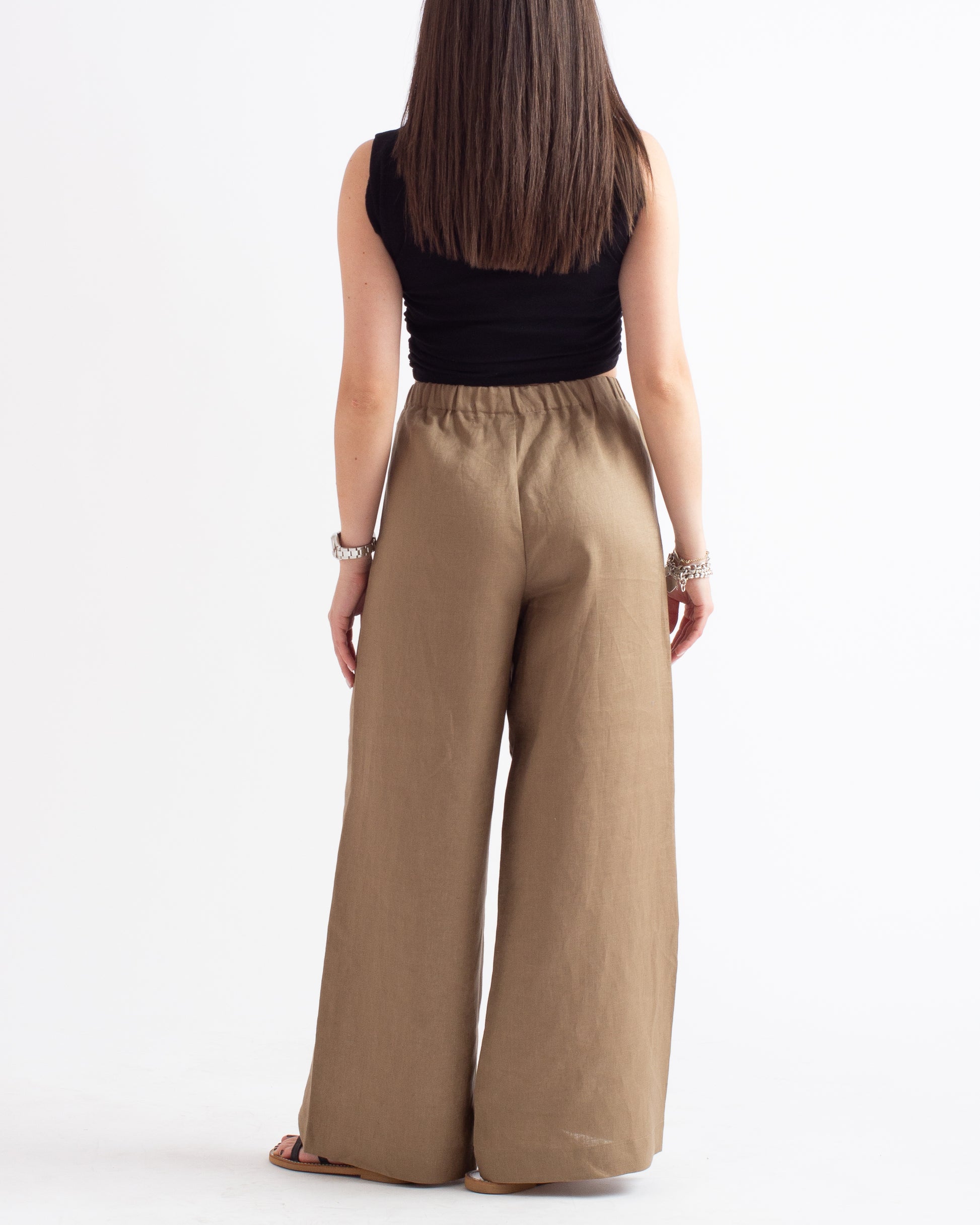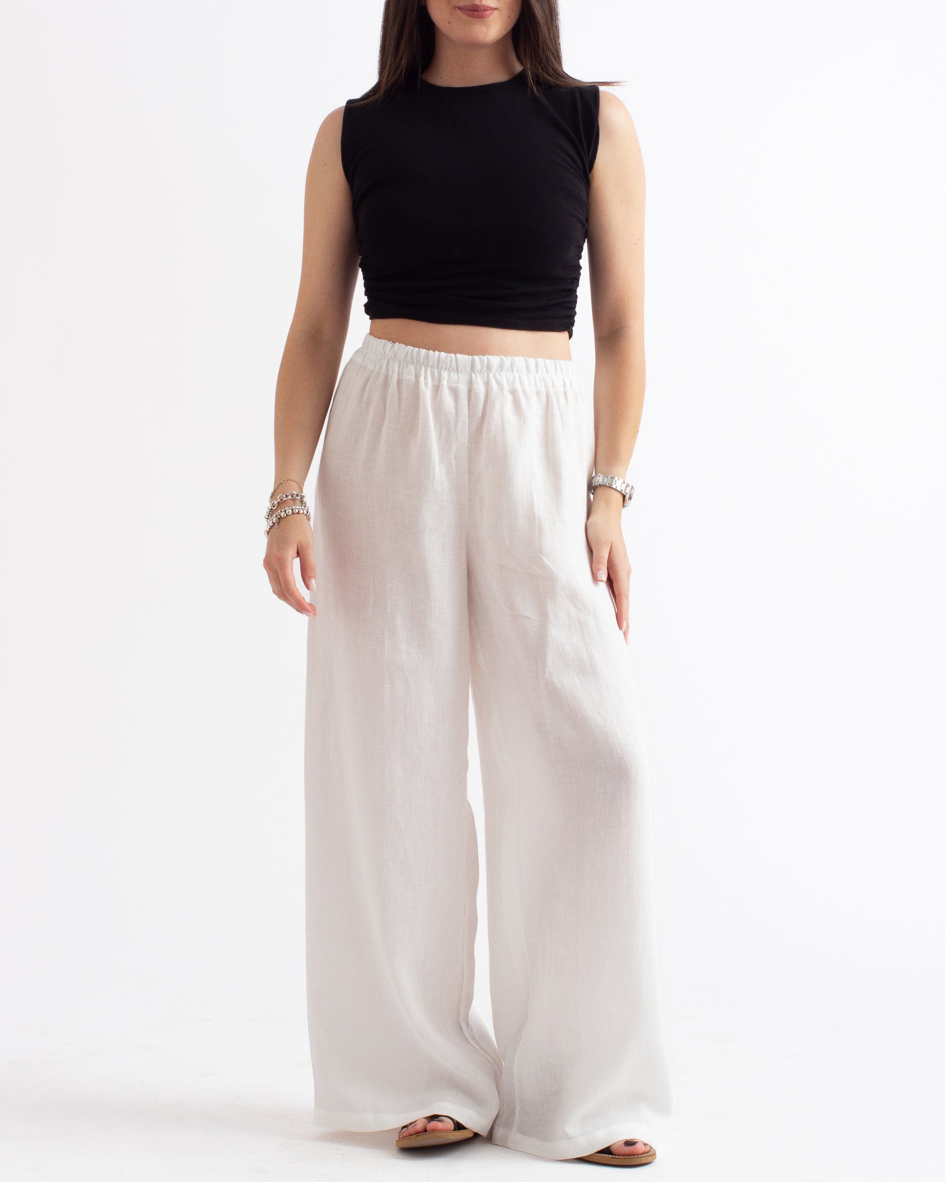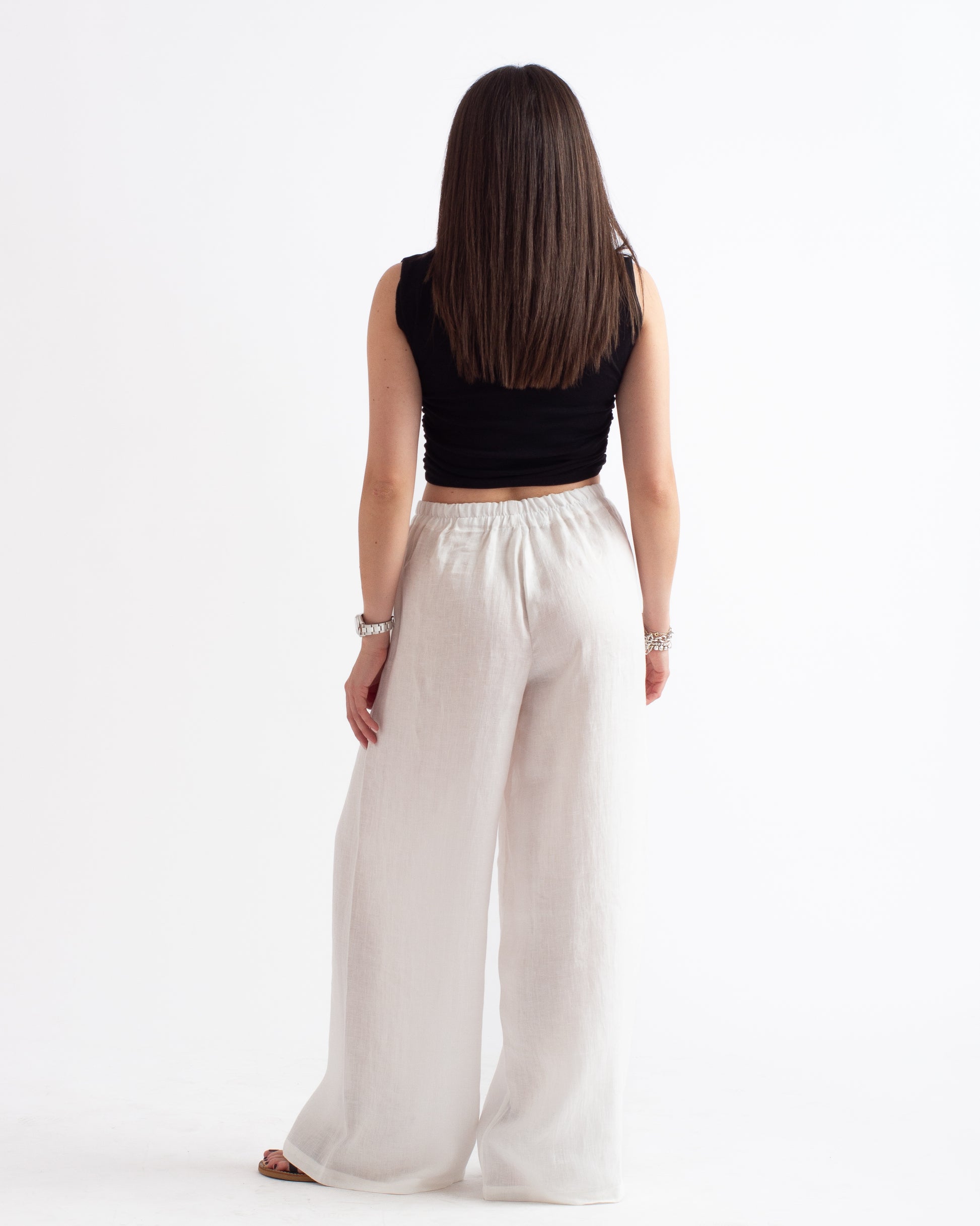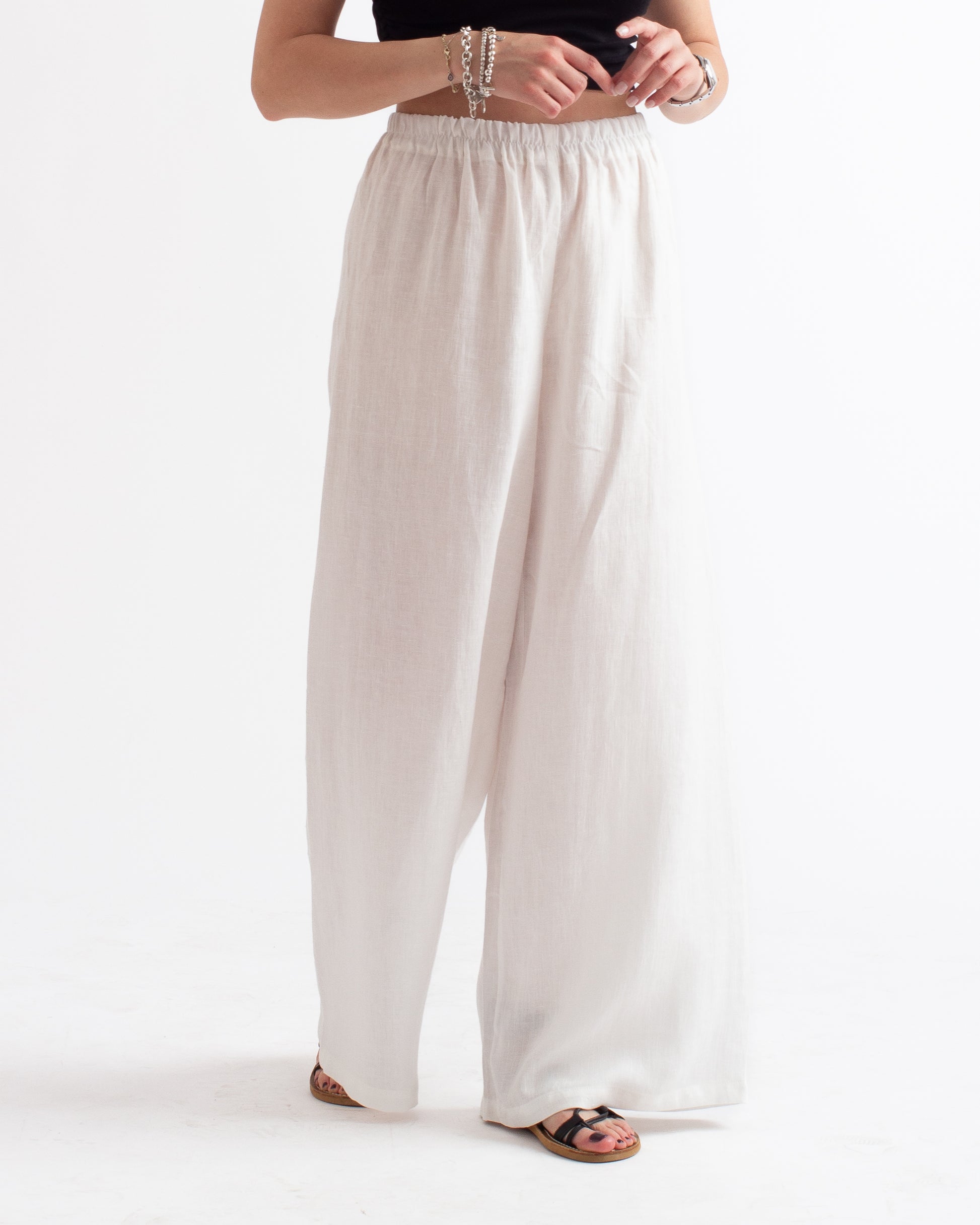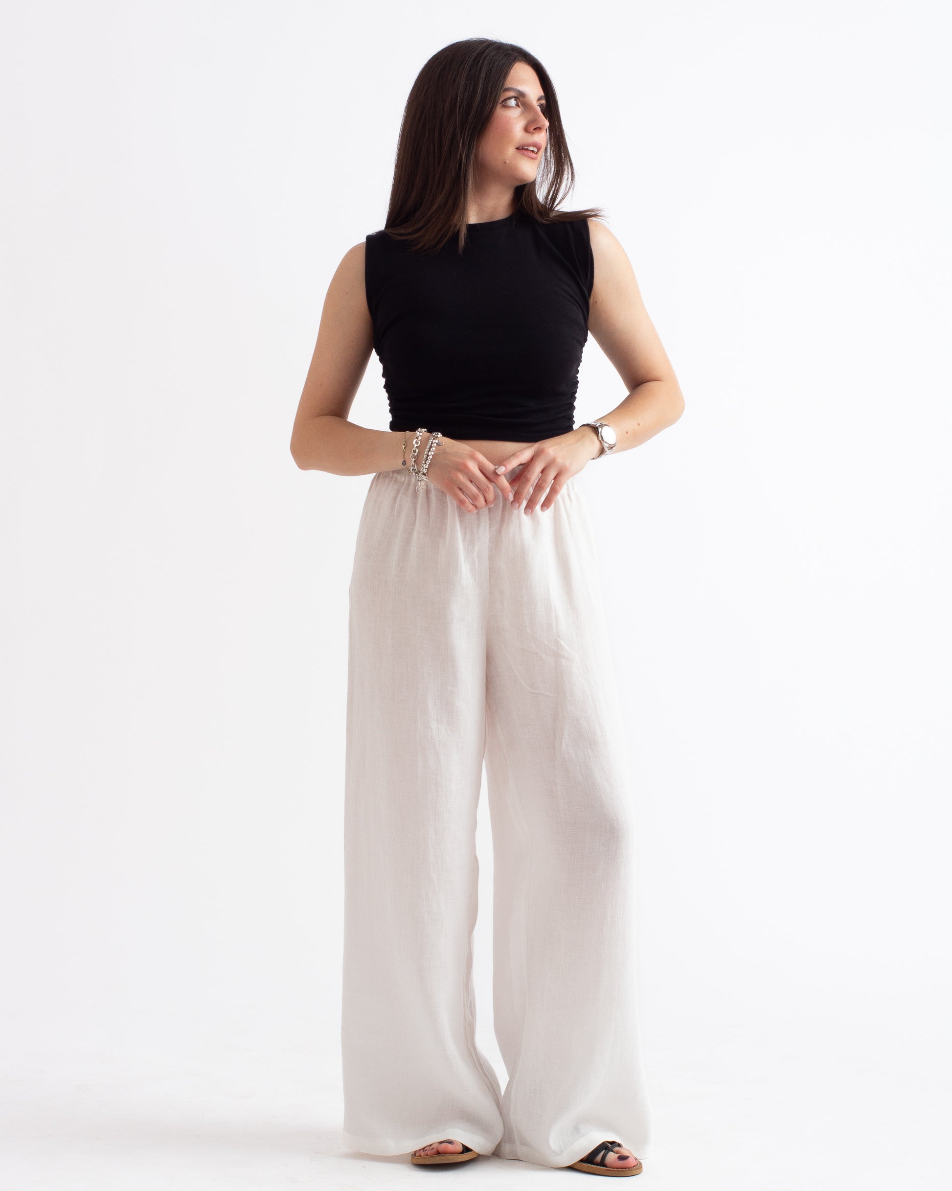 Pantalone palazzo morbido in lino 100% con elastico in vita, gamba ampia senza cucitura sul fianco.