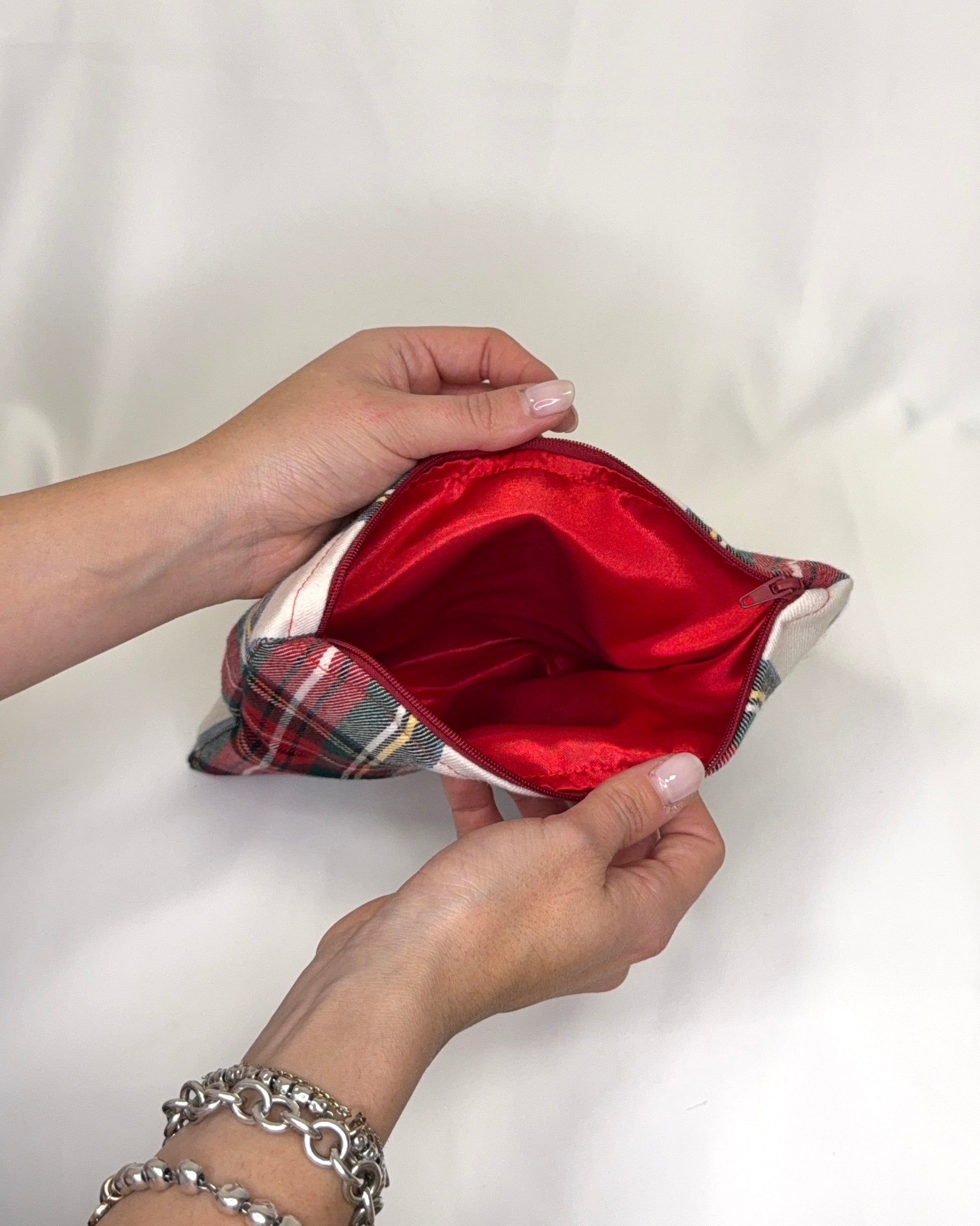 Elegante e capiente, questa pochette in Tartan è un accessorio unico per celebrare la magia delle feste. L’esterno in tartan classico si abbina perfettamente all’interno in raso prezioso, per un tocco di raffinatezza. Ideale come regalo o per completare il tuo look natalizio con stile e praticità.