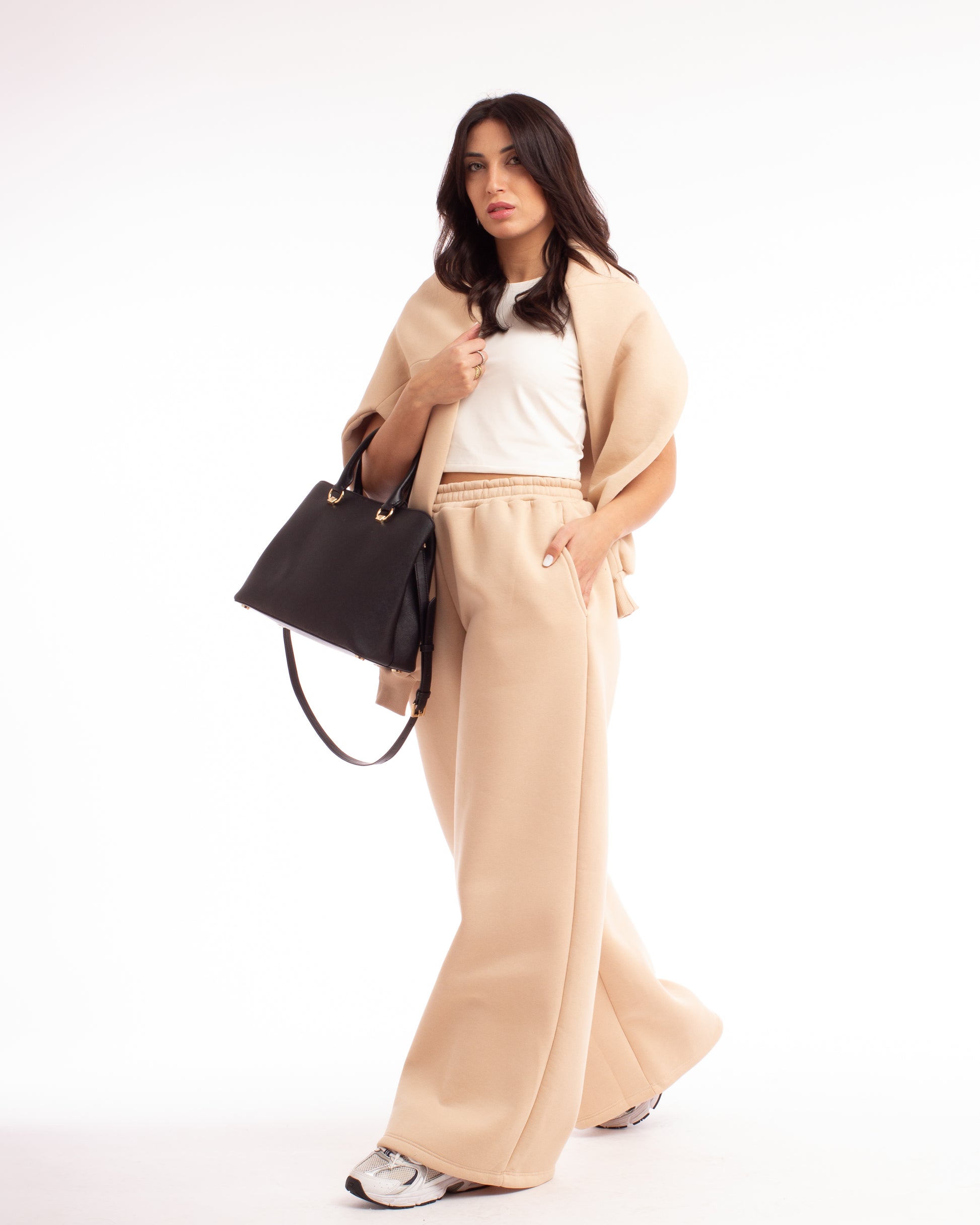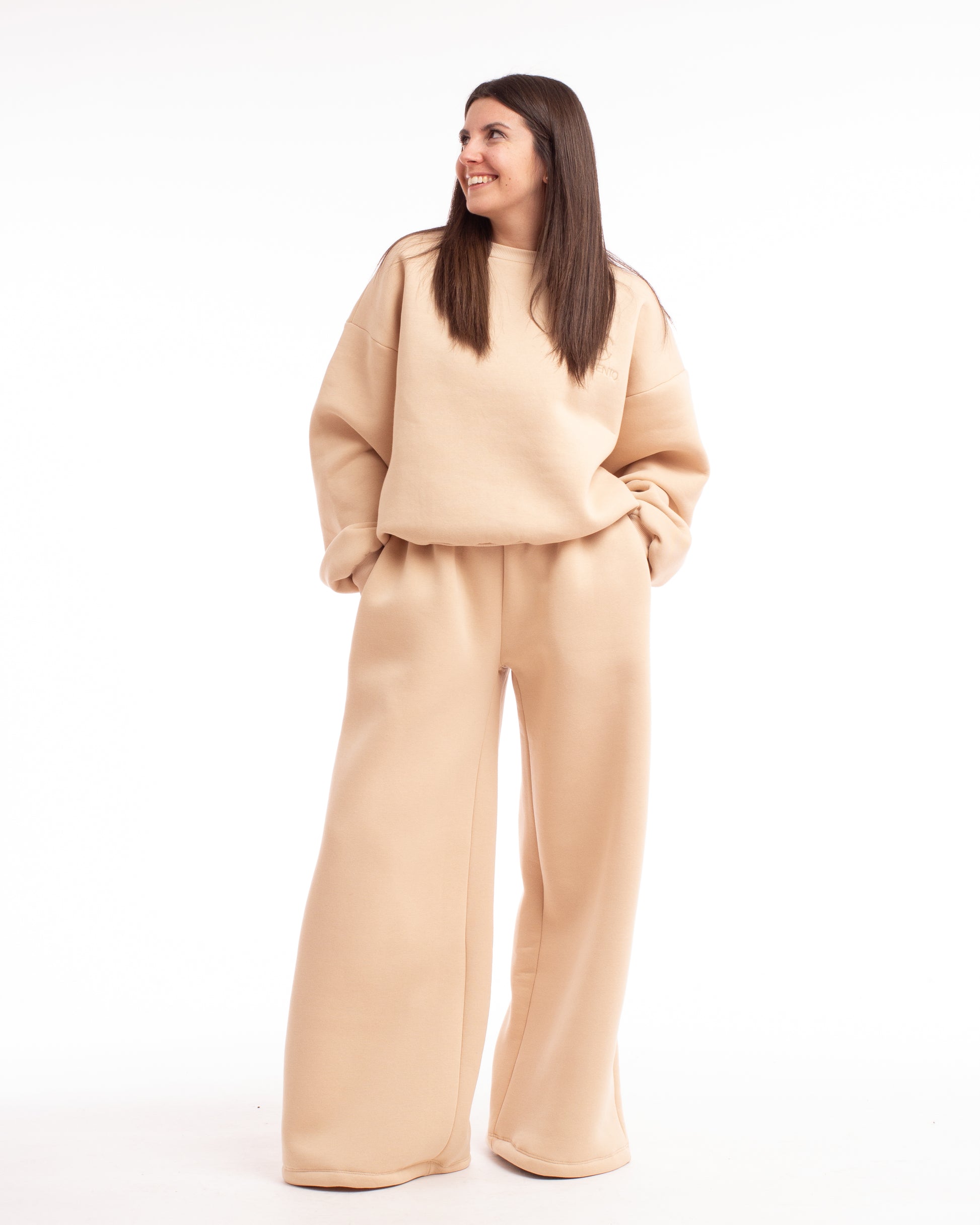 Immagina una tuta che ti faccia sentire sofisticata senza rinunciare al comfort. Muse è nata per questo. Realizzata con un tessuto incredibilmente morbido e di alta qualità, questa tuta accarezza la pelle e dona una silhouette sofisticata senza rinunciare alla comodità. È calda, chic e versatile: perfetta per un look ricercato sia dentro che fuori casa. Ideale per sentirsi una vera musa in ogni momento. La tuta è composta da una felpa con il logo ricamato tono su tono e un pantalone palazzo.